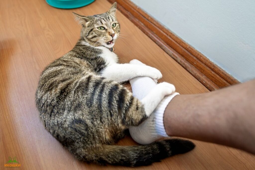 Кот кусает ногу
