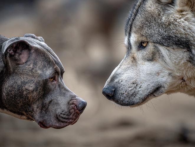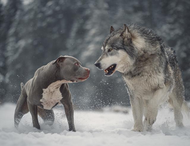 Изначально питбультерьера вывели для боёв. Если точнее, для травли быков. Волк же — хищник, чья «профессия» — добывать себе пропитание.