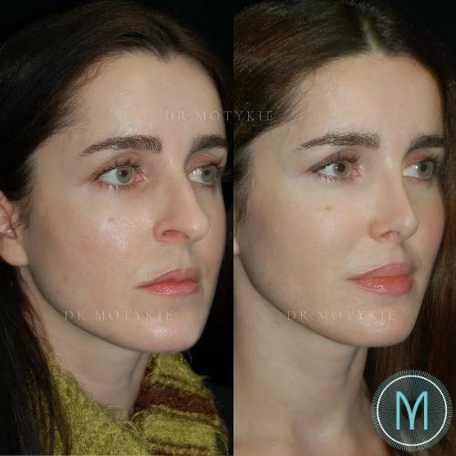 У этой 24-летней девушки была двойная проблема. Нос был крупный, орлиный, выдающийся и с нависающим вниз кончиком. Эти особенности были заметны и в профиль, и в анфас, что доставляло массу комплексов. Пластический хирург провел закрытую ринопластику, которая не оставляет шрамов снаружи. Спинка и кончик носа были выровнены и приведены к стандартной форме.