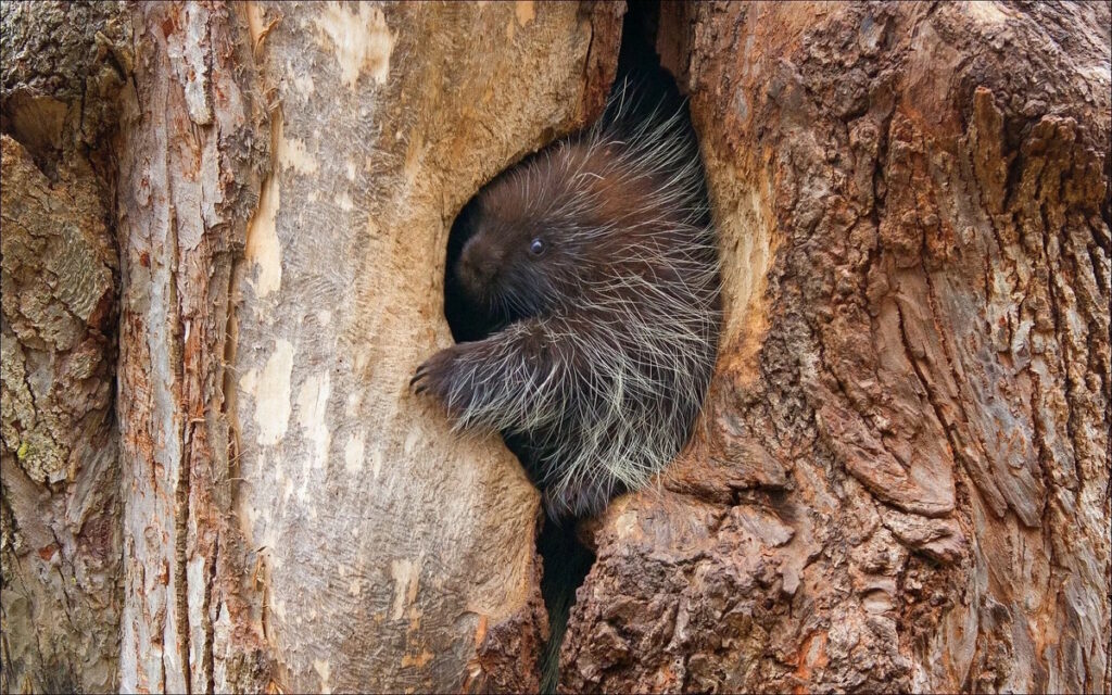Морда у него круглая, почти мультяшная: маленькие глазки и большой чёрный блестящий нос, из-за которого зверь выглядит смешным и безобидным. Да ещё и пушистый вон какой! Но за этой милотой скрывается мощнейший оборонительный механизм из 30 000 иголок. Под густым мехом спина и хвост поркупина покрыты жёсткими острыми шипами. Они вырываются при малейшем прикосновении, подло и надолго застревая в коже неприятеля.