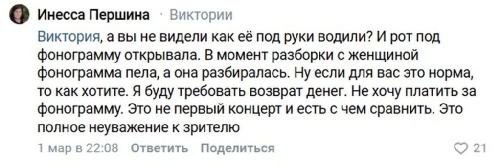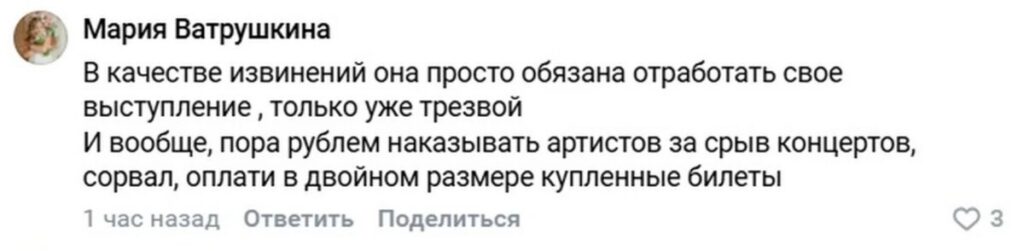 И, к слову, тревожные сигналы звучали ещё раньше. Незадолго до Пензы похожая ситуация случилась в Смоленске. Зрители тоже обращали внимание на странное поведение артистки. Но тур никто не остановил. Организаторы продолжали продавать билеты и отправлять её на сцену.