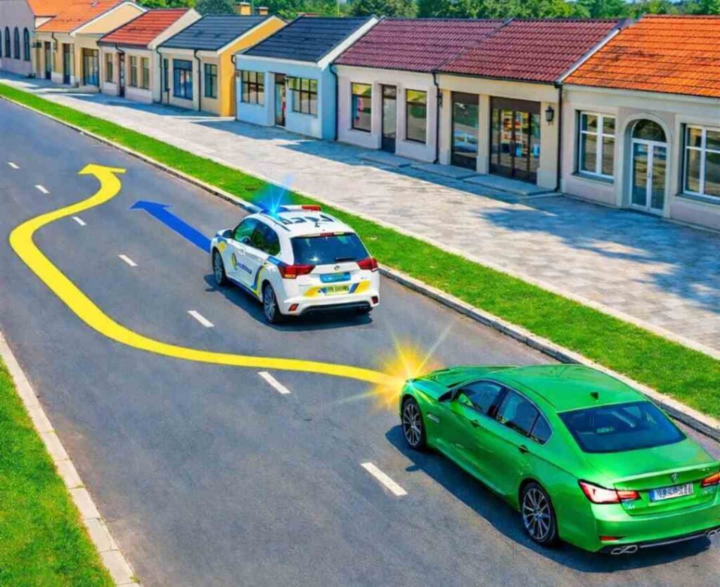 На изображении видно два автомобиля: впереди движется полицейский автомобиль, позади — зелёный легковой автомобиль, который намерен выполнить обгон. Дорожная разметка и знаки не запрещают этот манёвр. Имеет ли право водитель зелёного автомобиля выполнить обгон?