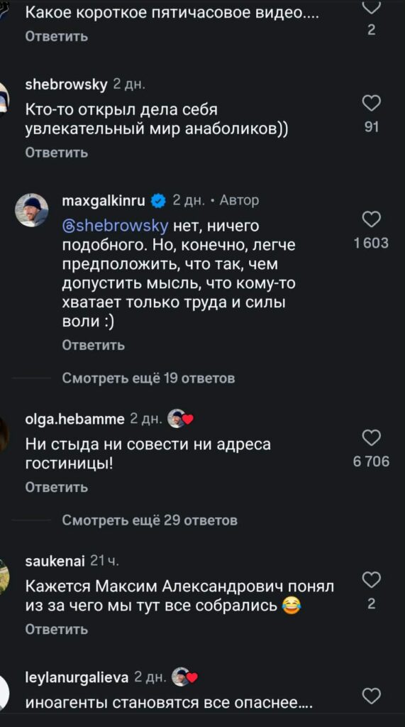 “А жена не против, что вы выставляете себя на всеобщее обозрение?”, “Видно, что устал от своей пожилой жены. Природа берет свое: Алла стареет, а Максим сегодня находится в своей лучшей форме. Конечно, организм бунтует. Отсюда и ролики в плавках”,