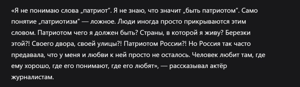 При этом сам актёр не забывает о трагедии своей семьи. Когда-то, ещё при советской сласти, родителей актёра репрессировали. Это событие отвернуло его от любой власти, сменяемой в стране.