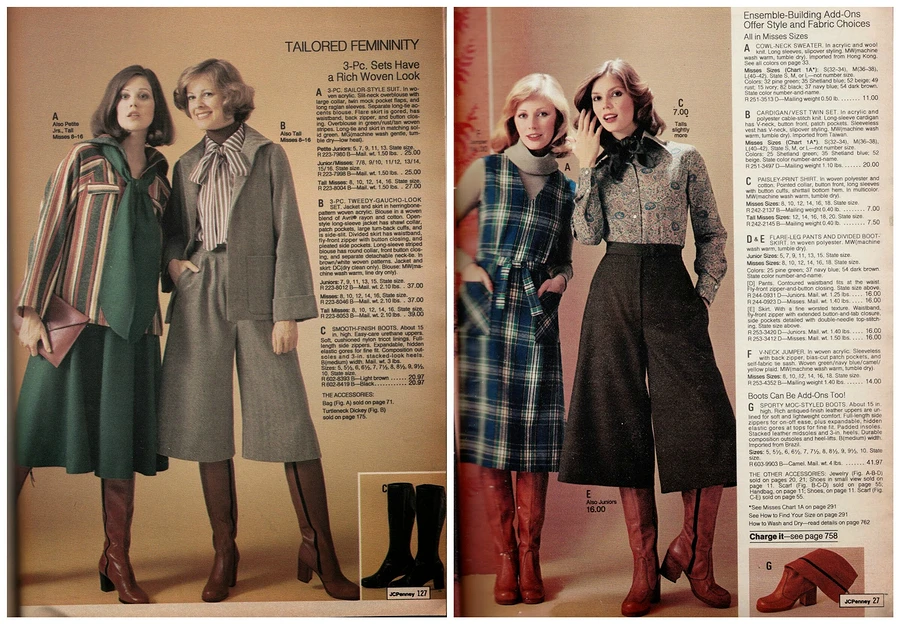 Интересный и нестандартный привет из 70-х, брюки гаучо, расклешенные от бедра брюки ниже колена. Впервые такой фасон появился у южноамериканских пастухов, а затем перекочевал в гардероб дам, которые много ездили верхом. Эти брюки чрезвычайно легко спутать с просторными кюлотами, но гаучо отличаются обязательным нюансом — широким поясом. В семидесятых годах этот фасон брюк стал очень популярным, причем в том числе в холодное время года.