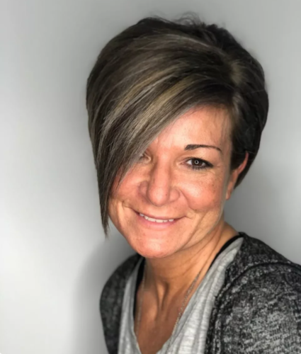 Зрелым женщинам лучше всего выбирать удлиненный в зоне макушки вариант пикси. Это поможет скрыть недостатки зрелой кожи.