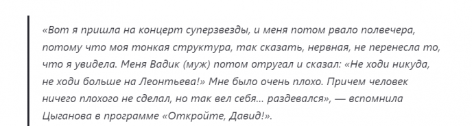 По словам артистки, коллега вел себя на сцене более чем раскрепощенно и даже возомнил себя танцовщиком на пилоне.  “Так вел себя, меня потом рвало полвечера. Мне было так плохо. Вадик (муж) отругал меня. Говорит: “Не ходи больше на Леонтьева”,- призналась певица.