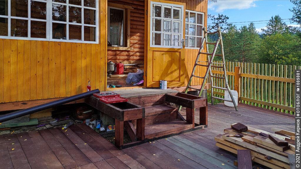 Особенно Жене пришлось повозиться с остеклением веранды. Опыта подобных работ у него не было, но всё получилось просто отлично. Кстати, я был удивлен, что из веранды ни во время съёмки фильма, ни сейчас, невозможно пройти в жилую часть дома. Все сцены «внутри» снимали не тут, а в павильоне на киностудии. Евгений по понятным причинам тоже не хочет показывать посетителям свои бытовые условия, но заглянуть на веранду меня впустил.