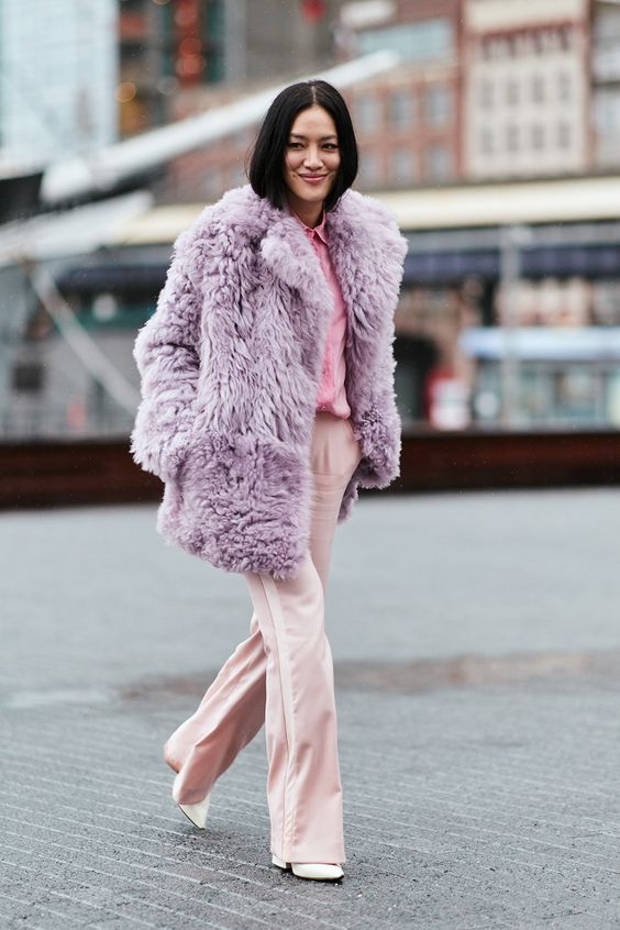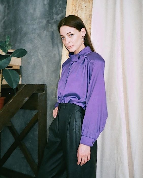 - Лиловый оттенок добавит в образ изюминку и придаст женственности. Лиловый и все вариации данного оттенка можно внедрять в любой лук — с разными элементами образа он будет смотреться по-новому. Обрати внимание на лиловые вещи из бархата, они олицетворяют шарм, загадочность и внутреннюю красоту.