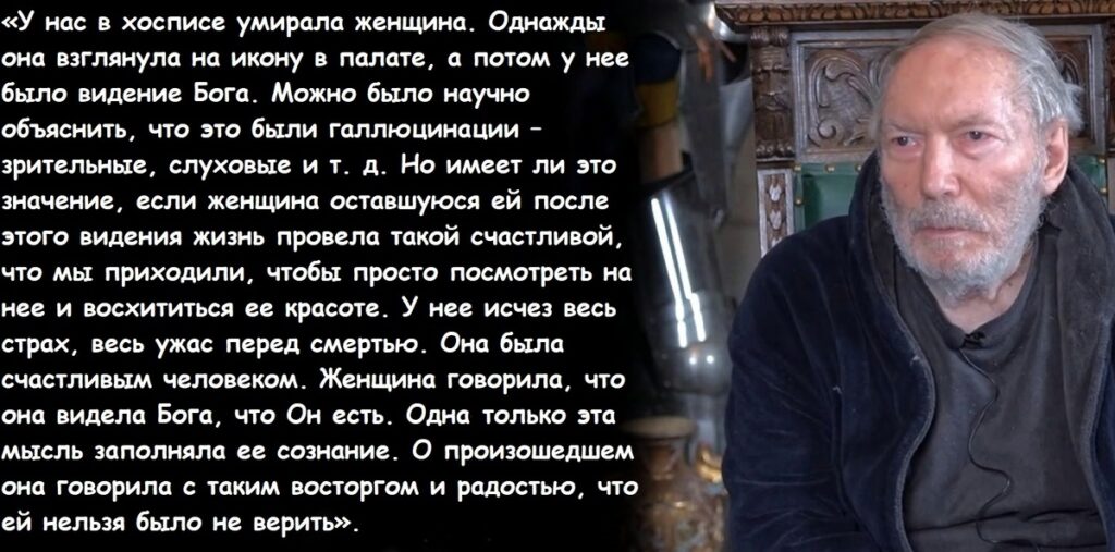 Чтобы подтвердить свои слова, врач приводил случай с пациенткой, которой оставалось жить считанные дни. В разговоре с Андреем Гнездиловым эта женщина рассказала о том, что всю жизнь она была неверующей, но в конце своих дней убедилась в обратном. Женщина удивленно говорила врачу:
