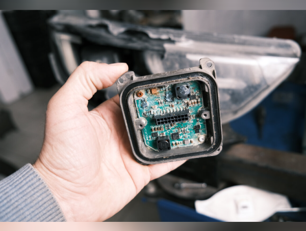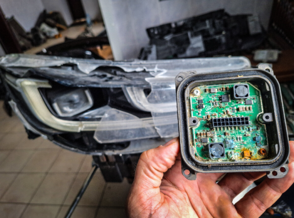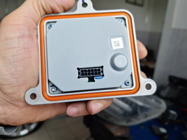 Опять, на вид серьёзная штуковина в алюминиевом корпусе, как в лучших традициях мирового автопрома. Но вытащив блок из фары, видим практически то же самое. Уплотнение резиновое есть, но сквозь отверстия всё так же просвечивается электронная плата, которая совершенно никаким образом не защищена от влаги.