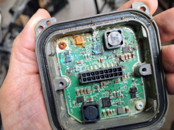 Обратите внимание на эту блестящую крышку из нержавейки, а также на ответную часть электрического разъёма. По идее, тут всё должно быть герметично, чтобы никакая влага ни при каких обстоятельствах не попала внутрь блока. Но там такие зазоры, что «палец пролезет». И если вдруг по какой-то причине влага будет попадать в фару, а судя по этому китайскому подходу, она там со временем окажется, то плату с её электронной начинкой будет ожидать примерно следующее: