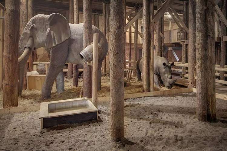 В ковчеге присутствуют деревянные модели животных, включая: гориллу, слона, носорога, леопарда и т.д.
