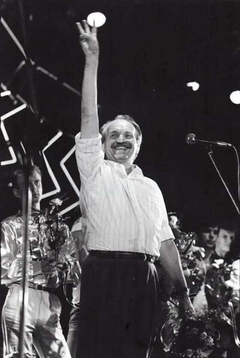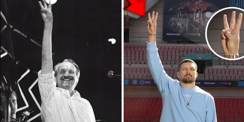 Такой жест раньше использовал Вячеслав Чорновил, политик и лидер Народного Руха Украины. Именно с таким знаком Чорновил изображен на памятнике во Львове, и именно так пальцы делали депутаты во время провозглашения независимости Украины в 1991 году.