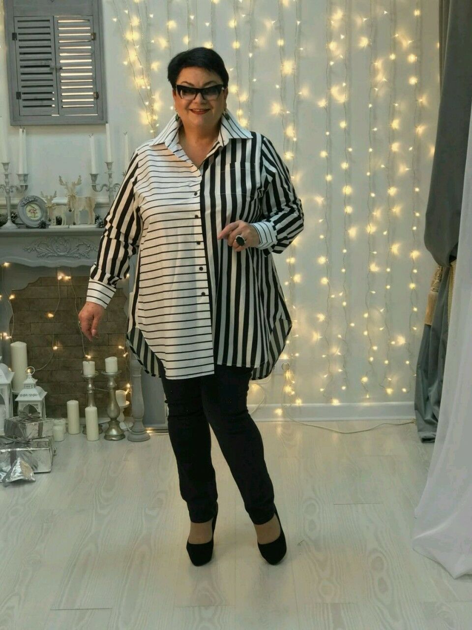 Модели туник бывают самые разные. Вы не отойдете от создаваемого стиля, если примерите асимметричного кроя удлиненный трикотажный полосатый свитерок или белую с гламурным воротом блузку.