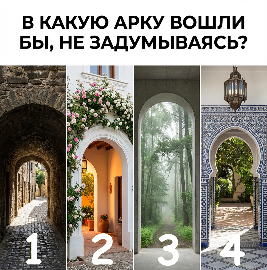 Такие визуальные задачи — отличный способ проверить свою внимательность и немного отвлечься от повседневной суеты. Иногда мы настолько привыкаем видеть мир однобоко, что забываем: за любой «дверью» скрывается бесконечное множество возможностей. Какая бы арка ни притянула ваш взгляд первой — серая старина, уютный дворик, туманный лес или восточная роскошь — это отражение того, что сейчас для вас наиболее ценно. А теперь, когда вы совершили свой выбор, самое время поделиться им с другими. Ведь всегда любопытно узнать, что именно привлекает окружающих: стремление к покою, желание домашнего уюта, жажда лесного уединения или тяга к экзотическим приключениям. Посмотрите в комментариях, совпадают ли ваши предпочтения с выбором других людей, или же вы оказались в меньшинстве? Возможно, именно ваш выбор окажется самым неожиданным и интересным для всех нас.