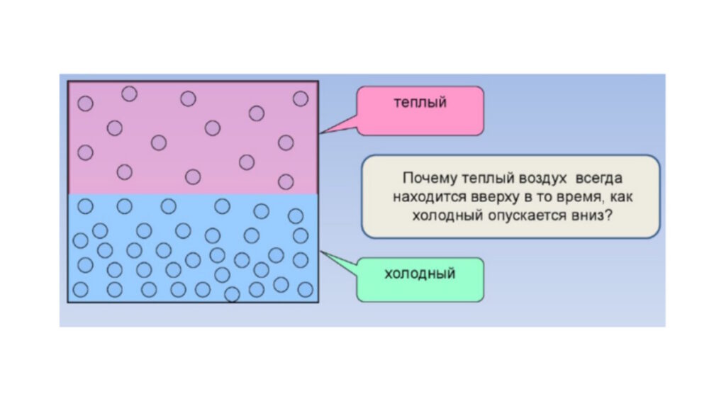 Холодный воздух плотный и тяжелый. Молекулы его движутся медленно и «жмутся» друг к другу. Под действием гравитации такой воздух стремится вниз. Теплый воздух разреженный и легкий. Молекулы активны, расстояние между ними больше. Он всплывает вверх, как поплавок.