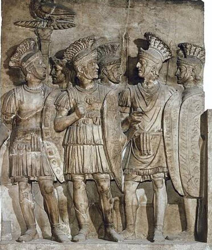 Преторианцы, элитная стража императора, имели более богато украшенные шлемы, часто с гребнями из белого или черного конского волоса.