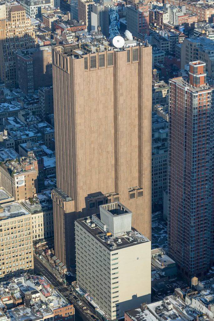 29 этажей (167,5 метра), облицованных красным гранитом. Ни одного окна — только глухая стена с редкими вентиляционными решётками на 10-м и последнем этажах. Один-единственный вход. На крыше — огромные спутниковые тарелки, которые словно подглядывают за небом. И главная странность для Нью-Йорка: ночью здание не подсвечивается. Оно просто исчезает в темноте, становясь чёрным прямоугольником на фоне сияющего города.