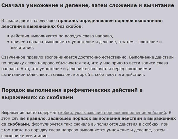 Если же в примере есть скобки, то действия в них выполняются в первую очередь по озвученному выше правилу.
