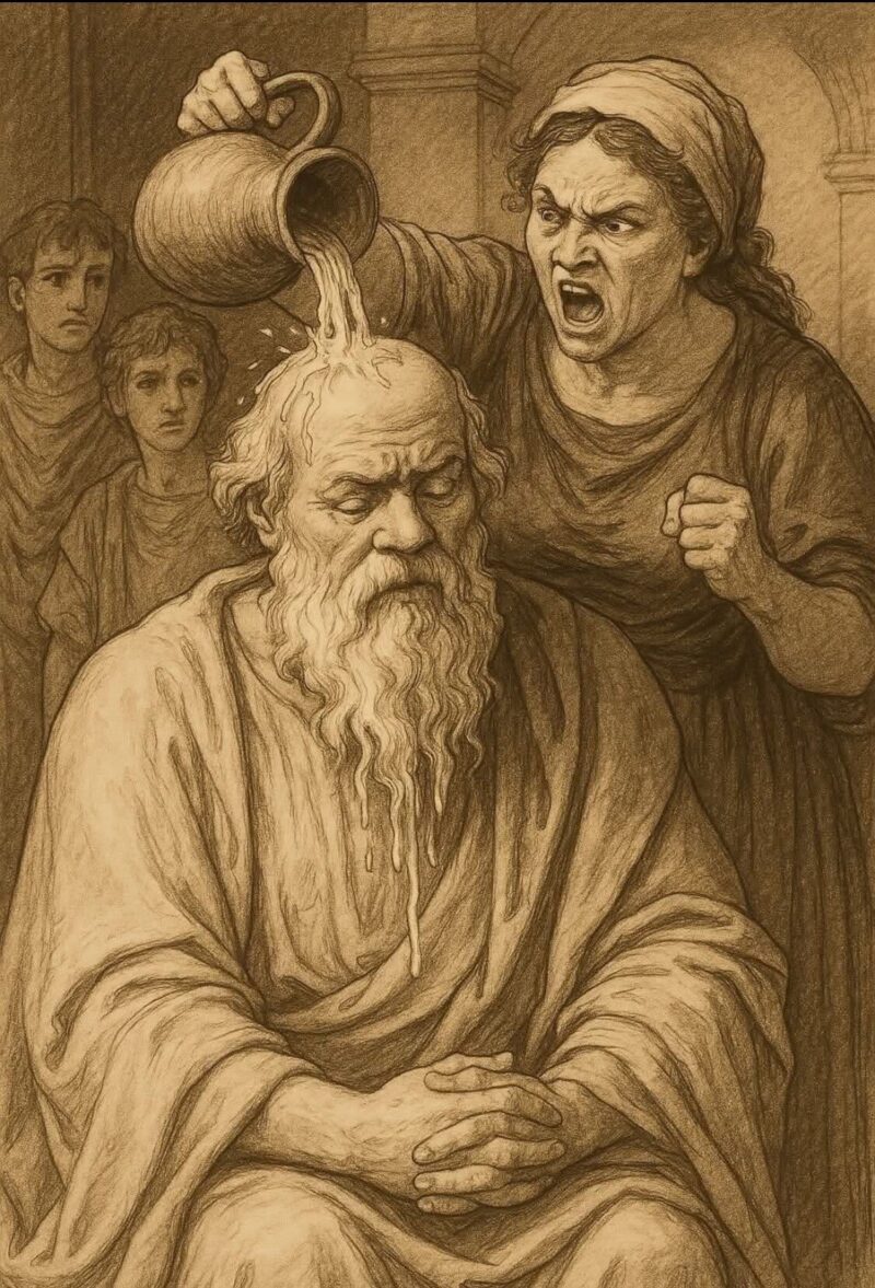 Кто бы мог подумать, что Сократ, мудрый человек, известный своим остроумием и спокойствием, живет вместе с взрывным характером, гневом и громкими сценами ежедневно? Его жена была известна своим острым языком, могущественным характером и постоянным недовольством. Каждое утро она буквально выгоняла его из дома, и только когда зашло солнце, он возвращался.