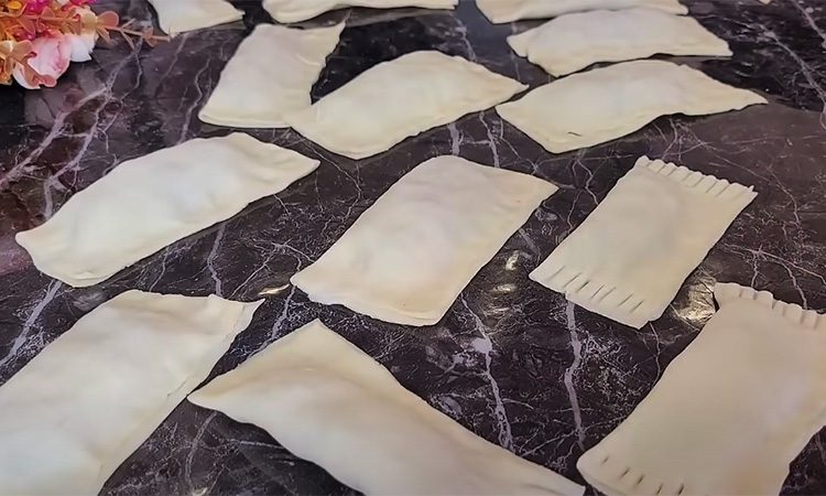 Когда тесто «отдохнуло», раскатываем его тонкой большой лепешкой, сворачиваем в несколько слоем и разрезаем на прямоугольники. Разворачиваем прямоугольники, складываем один на другой и снова разрезаем на прямоугольники.
