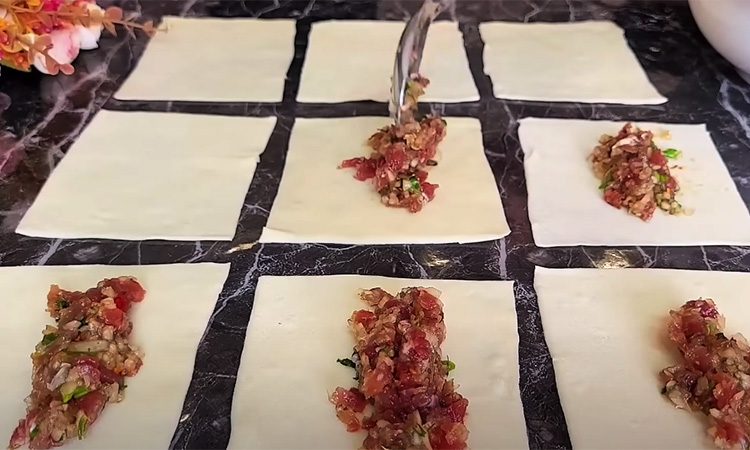 В каждый кусочек теста кладем фарш и закрываем тесто.