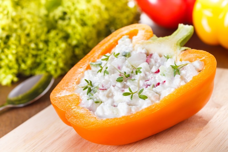 - Затем набиваем перцы получившейся творожной смесью. Масса должна быть плотной.