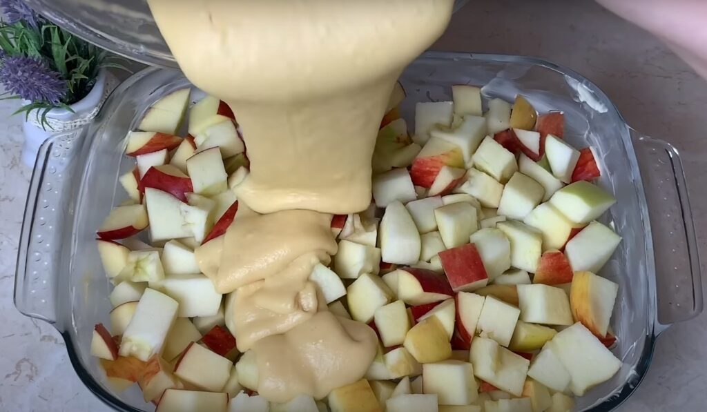 Форму для выпечки смазываем сливочным маслом. На дно формы выкладываем все яблоки и равномерно их разравниваем. Заливаем яблоки тестом.