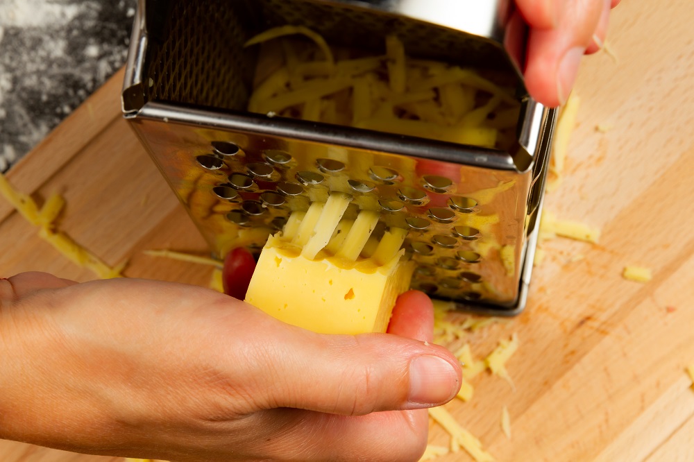 Твердый сыр натри на крупной терке и добавь к фаршу.