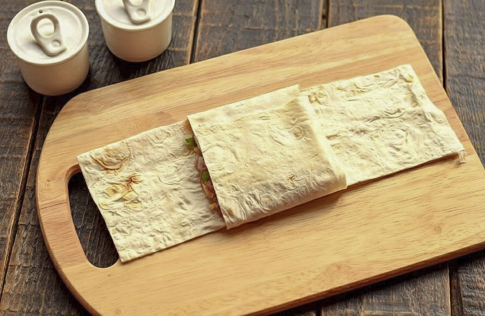 Теперь загни те части лаваша, которые находятся ближе к столу. Таким образом ты будто прикроешь начинку. После этого загни две оставшиеся части полоски из лаваша, создавая своеобразный конверт.