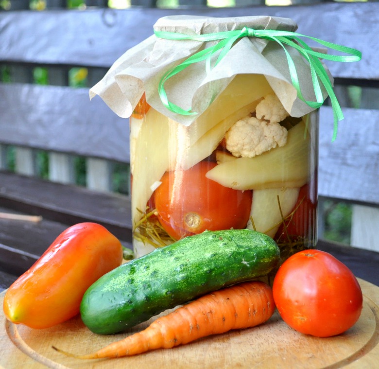 Ассорти получается вкусным… Вкус необыкновенный, рецепт моей прабабушки. Овощи получаются упругие, хрустящие. Попробуйте раз, уверяю, вы будете мариновать овощи только таким способом. Все очень просто…