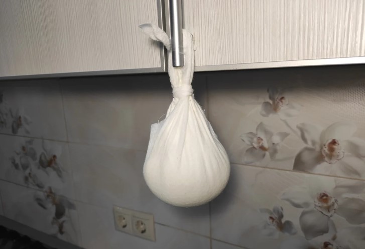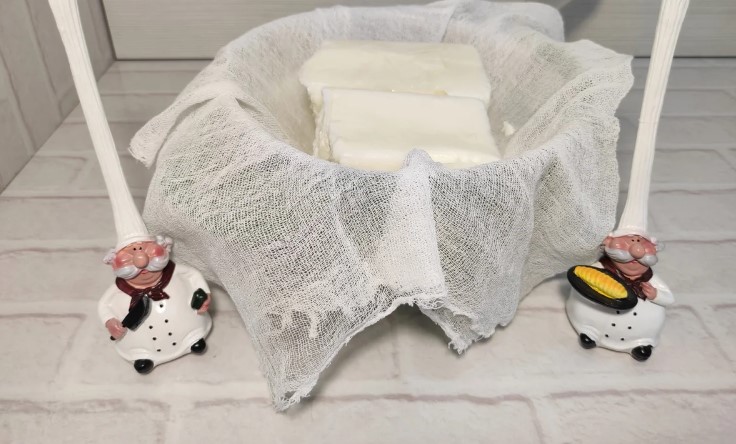 Снимаем упаковку, а замерзший кефир кладем на марлю в сито. По мере таяния будет стекать сыворотка. Марлю складываем в несколько слоев.