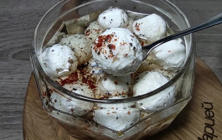Аккуратно укладываем в емкость с маслом творожные шарики, закрываем емкость крышкой и ставим на несколько часов в холодильник, чтобы шарики пропитались ароматами и вкусами приправ.