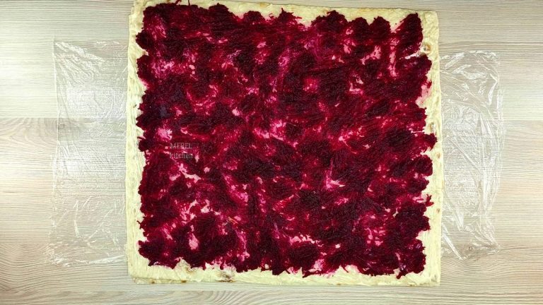 Далее две вареных свеклы натираю и отжимаю лишний сок, после чего равномерно распределю по лавашу.