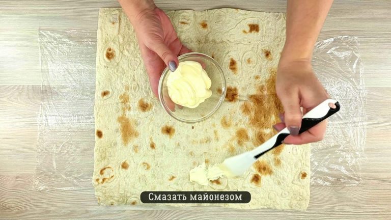 Для начала я использую армянский лаваш размерами приблизительно 35×40 см. Намазываю его майонезом и накладываю сверху второй лист.