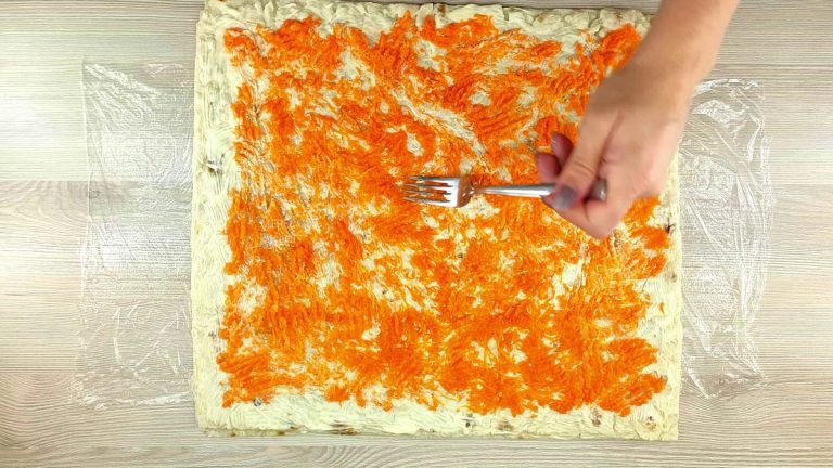 Следующим шагом кладу еще один лист лаваша и натираю две вареные моркови.