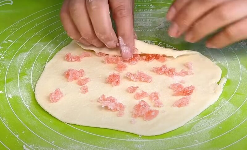 Делим тесто на колобки по 85 грамм каждый. Раскатываем колобки в лепешки толщиной 2-3 мм. Измельчаем мармелад и выкладываем его на поверхность теста.