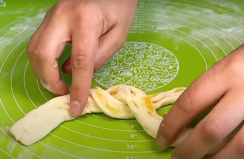 Делим рулет вдоль не доходя до конца. Складываем из двух концов теста косичку, сворачиваем ее в улитку.