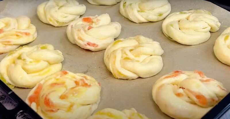 Конец каждой улитки прячем внутрь. Выкладываем булочки на противень застеленный пергаментом на расстоянии друг от друга.