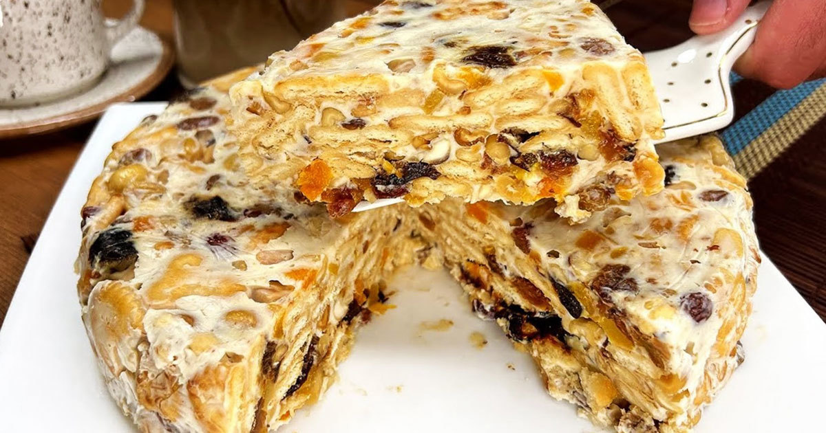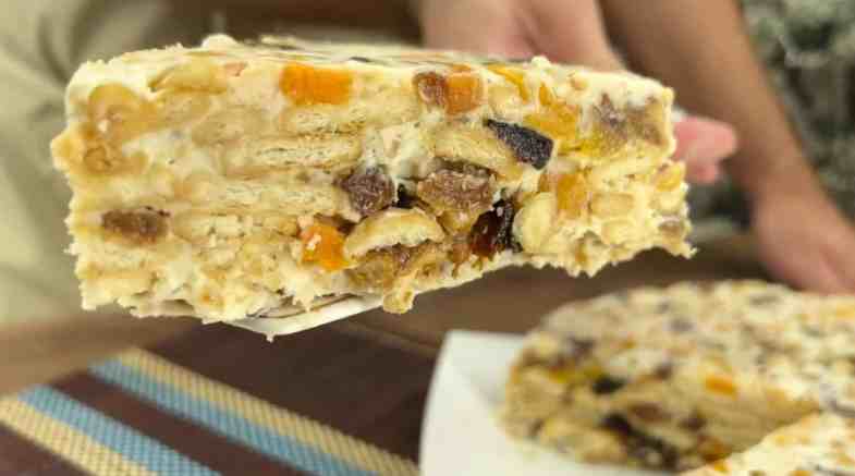 Выходит очень необычный рождественский торт из сухофруктов. Отличный вариант десерта без муки и выпечки.