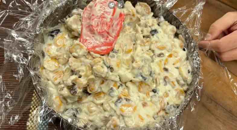 Застилаем глубокую форму пищевой пленкой, выкладываем на дно смесь и утрамбовываем.