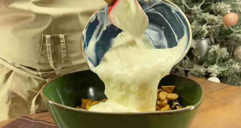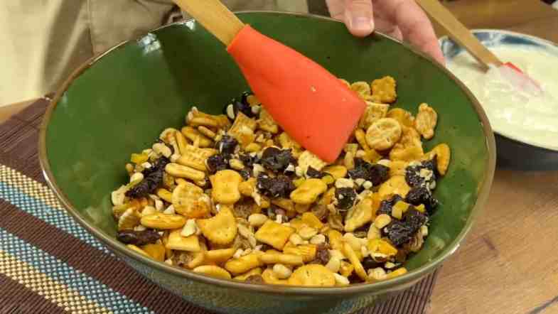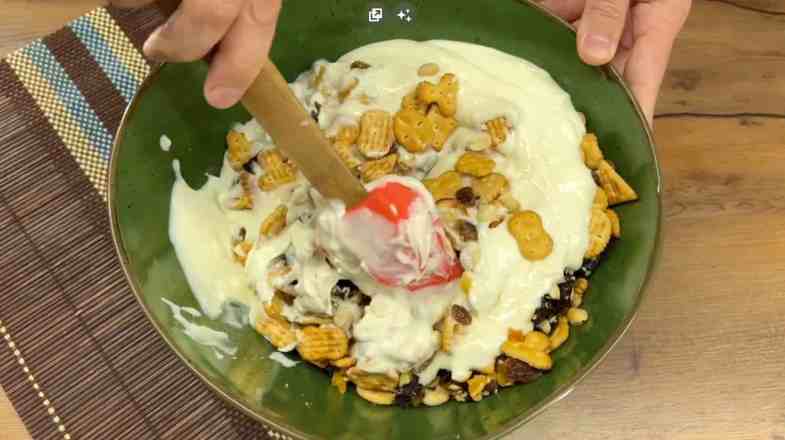 К ним выкладываем крекер, изюм, чернослив, арахис, курагу и грецкие орехи, перемешиваем. Если у вас большой крекер, лучше поломайте его на более мелкие кусочки.