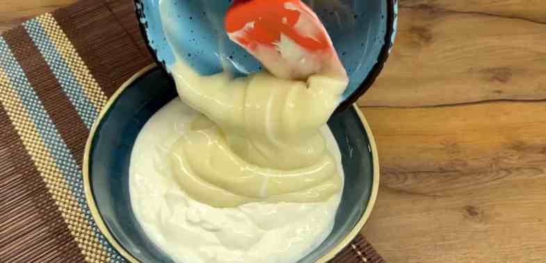 Смешиваем в отдельной миске сгущенку и сметану, добавляем ванилин.