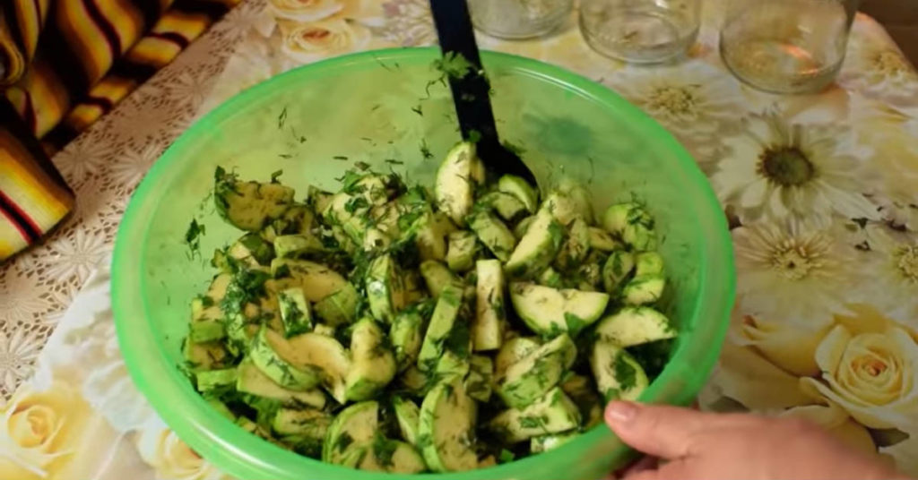 Зелень мелко поруби, а острый перец нарежь тонкими колечками. Добавь их к кабачкам. Аккуратно перемешай продукты. Оставь их часа на 3. Тем временем промой банки.