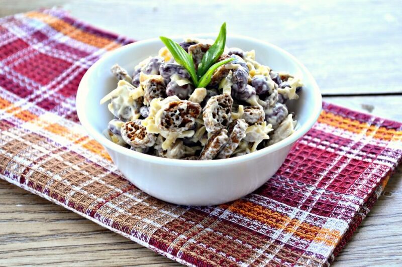 Итак когда добавили сыр, заправляем наш салатик майонезом и даём постоять. Тут тоже по вашим предпочтениям я люблю когда сухарики хрустят, поэтому даю постоять салату 10 минут, если вы любите что бы сухарики размякли дайте салатику постоять подольше.