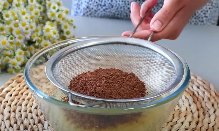 В миске соедините тёплую воду, сахар, щепотку соли и мёд (или варенье). Перемешайте, чтобы сахар частично растворился. Влейте растительное масло, снова размешайте. Добавьте соду, перемешайте, затем просейте какао. После этого небольшими порциями просеивайте муку, замешивая тесто до гладкости, чтобы не было комков.