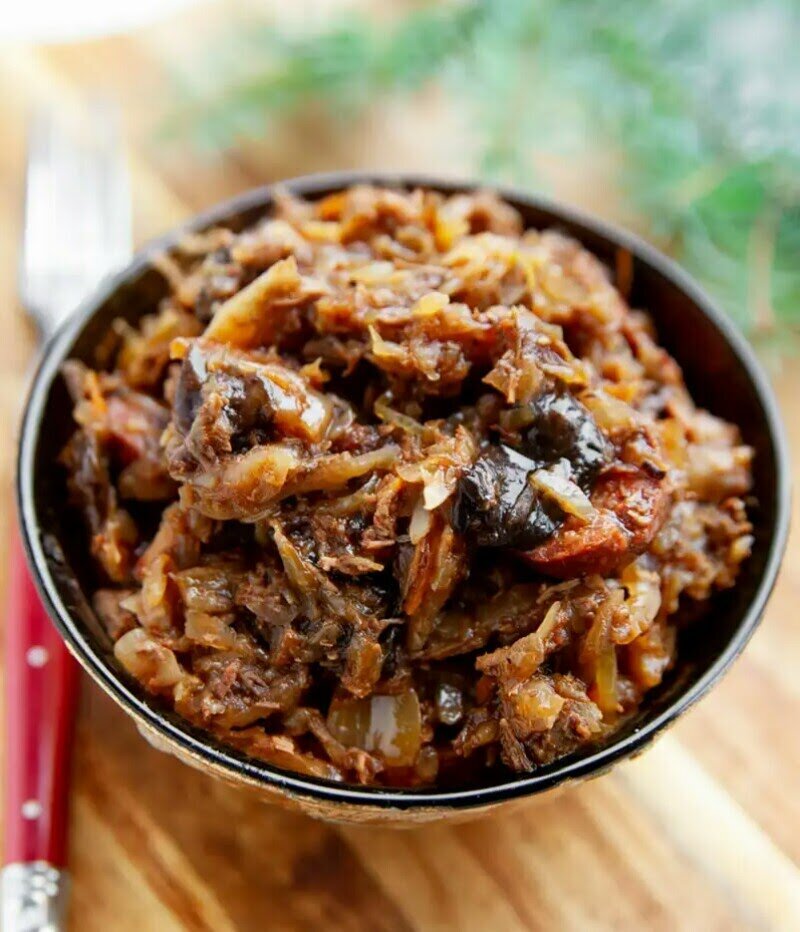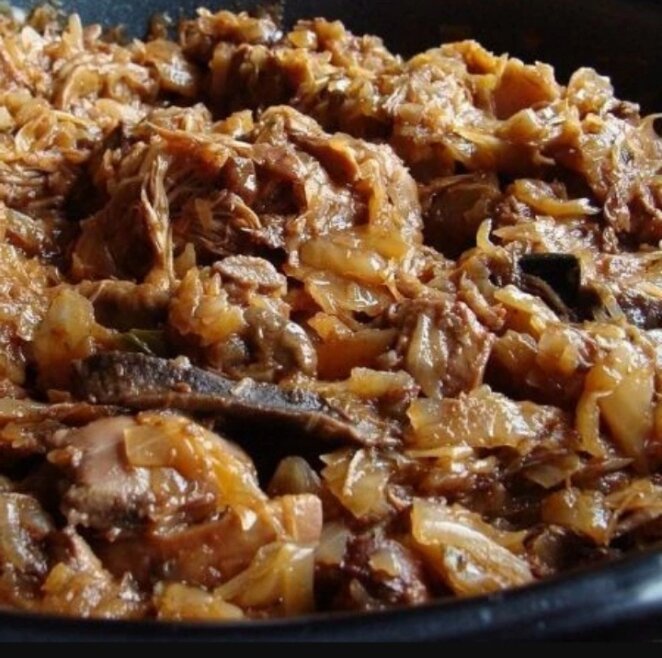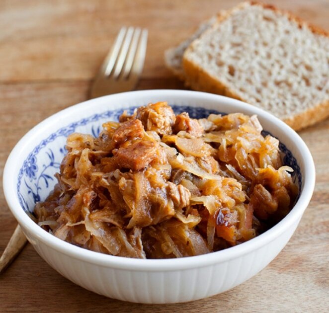 Любая: с копчеными ребрышками, с грибами или с курицей, с беконом (на сале) или с черносливом. Или с колбасками или с сочной свининой — чтобы тушеная капуста не была «вареной» и мягкой, чтобы была нежная, но с приятным легчайшим хрустом.