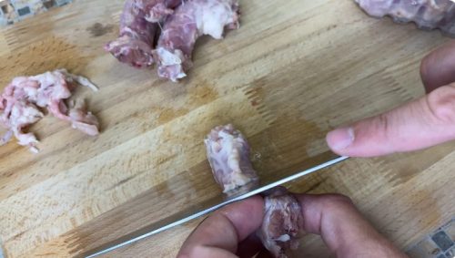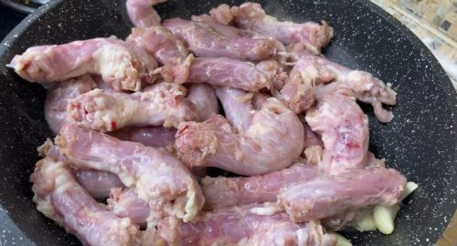 Берем куриные шейки и слегка их зачищаем. Я частично срезал жирок, там где его слишком уж много, и некоторые шейки были реально грязные, поэтому проследите за их чистотой. Затем я рекомендую промыть шейки под проточной водой.