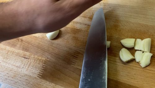 Возьмем головку чеснока, почистим зубчики и просто раздавим их ножом. Чеснока в этом рецепте много не бывает, так что можете взять хоть 3 головки.